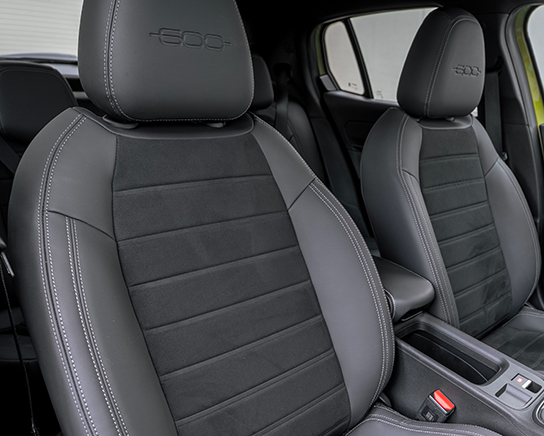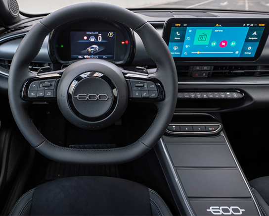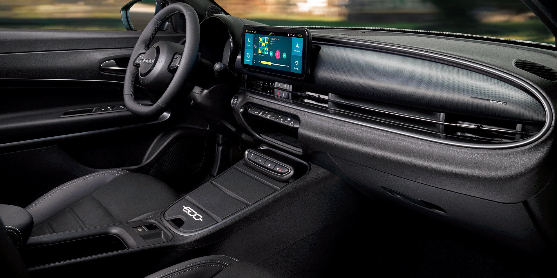 Montez à bord de la nouvelle Fiat 600 Sport et découvrez un intérieur noir qui redéfinit l'élégance moderne. La nouvelle finition du tableau de bord, les sièges sportifs et les panneaux de porte noirs élégants créent une atmosphère qui allie confort et caractère. Chaque élément est conçu pour vous plonger dans un univers stylé, vous permettant de ressentir l'énergie pure de la 600 dans chaque détail.
