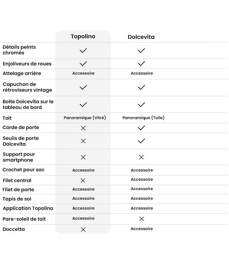 Découvrez tous les détails de votre nouvelle Topolino & Topolino Dolcevita et choisissez la version qui correspond le mieux à votre style de vie et à vos besoins.