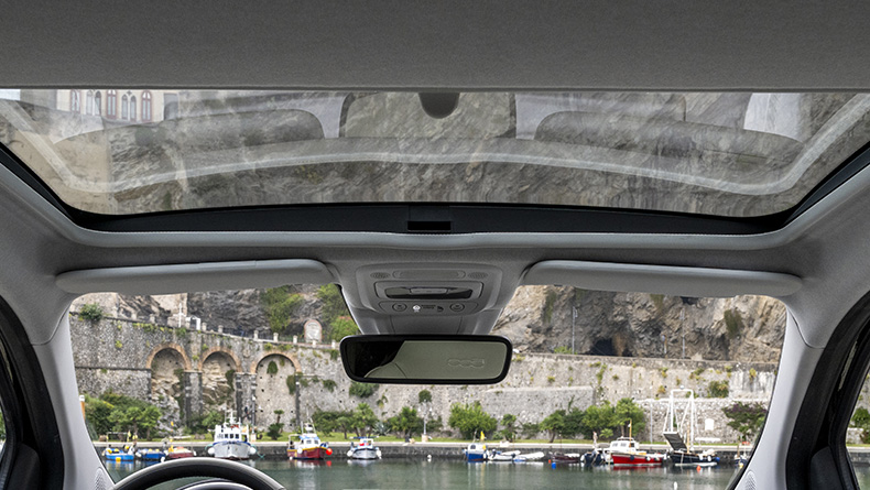 Laat de wereld binnen via het glazen dak, zodat je Fiat 500e wordt overspoeld met natuurlijk licht en een vleugje stijl voor elke rit.